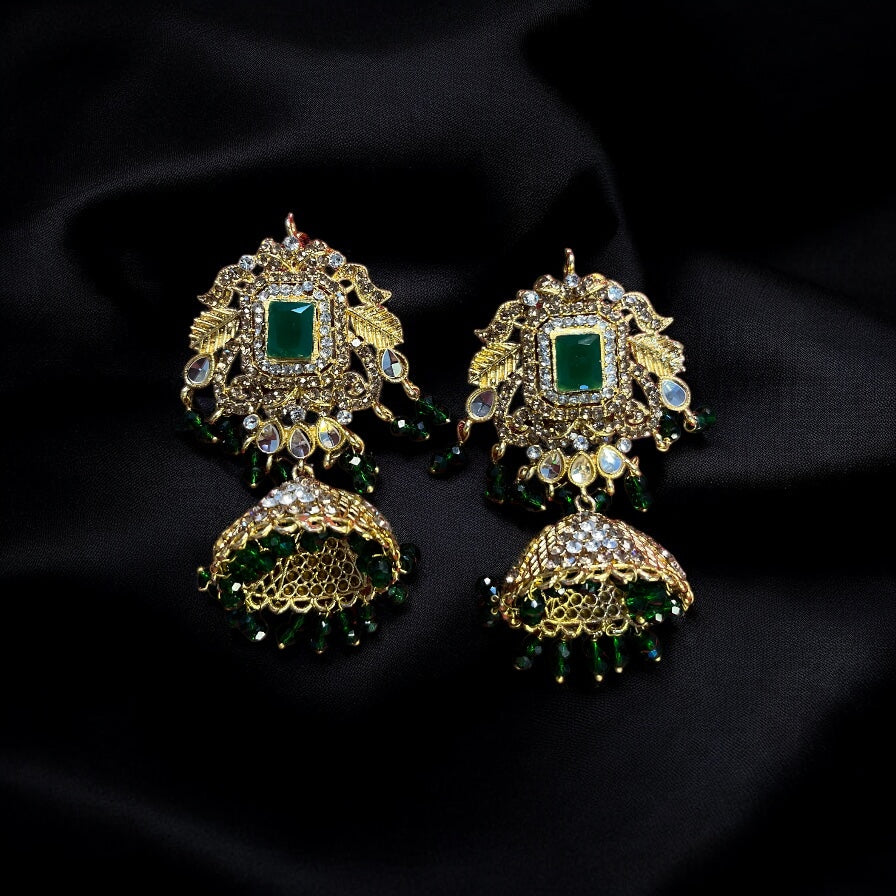 ·        Dual jhumka design with crystal and green bead tassels